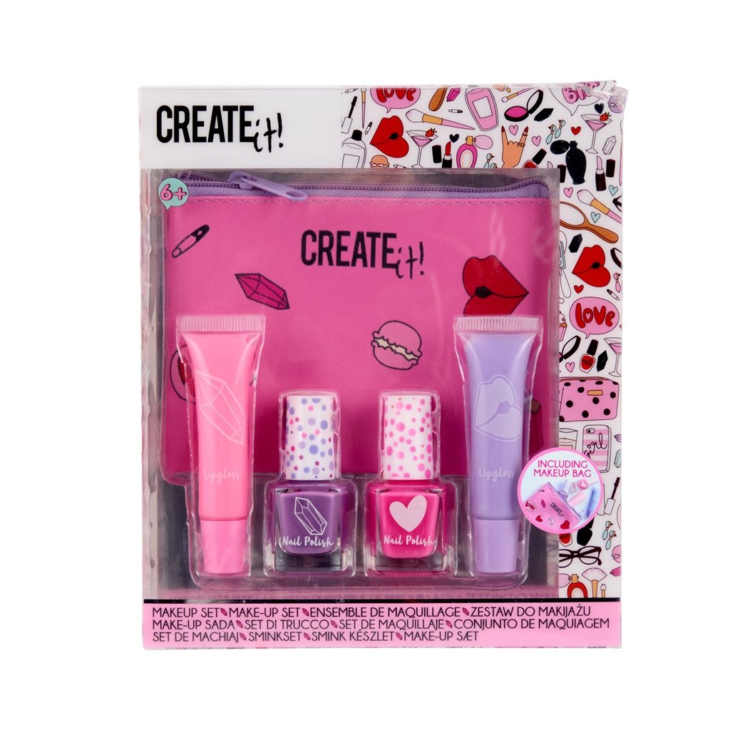 Create it! Make-up sada – všetko, čo potrebuješ na perfektný a farebný look! Lak na nechty, lesky na pery a kozmetická taštička v jednom balení. Bez parabénov, dermatologicky testované a vhodné pre dievčatá od 6 do 14 rokov.