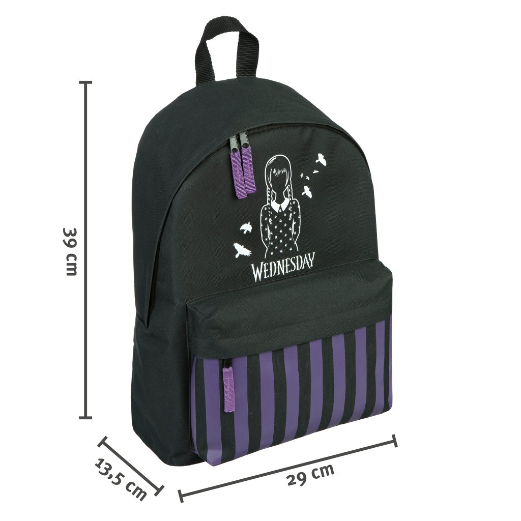 Batoh Wednesday s originálnym motívom spája praktický dizajn a osobitý štýl. Ponúka priestrannú hlavnú priehradku a predné vrecko na drobnosti alebo desiatu – ideálny pre školákov aj študentov. Vyrobený z odolného polyesteru, tento školský batoh je perfektný na každodenné nosenie, výlety aj voľný čas. Štýlový, praktický a trvácny – batoh Wednesday je spoľahlivý spoločník do školy aj na cesty.