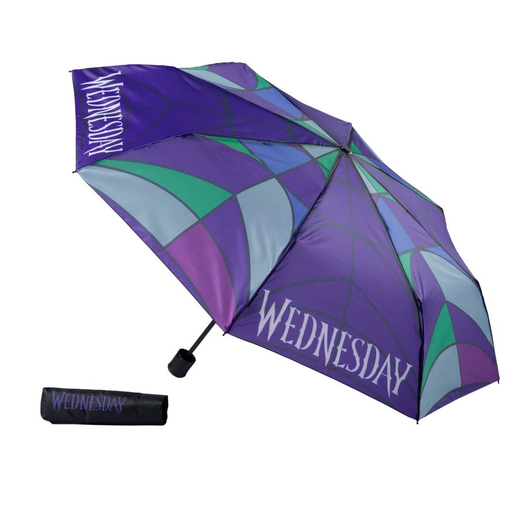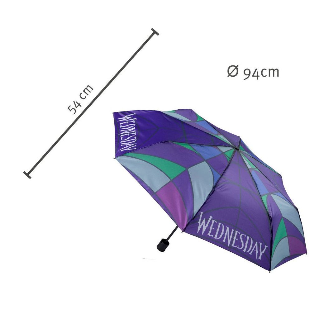 Skladací dáždnik s motívom Wednesday spája temne elegantný dizajn s praktickým prevedením. Vďaka kompaktným rozmerom (priemer 94 cm v otvorenom stave, dĺžka 25 cm v zloženom) sa ľahko zmestí do batohu aj kabelky. Spoľahlivo chráni pred dažďom a je ideálny na každodenné použitie aj výletné aktivity.