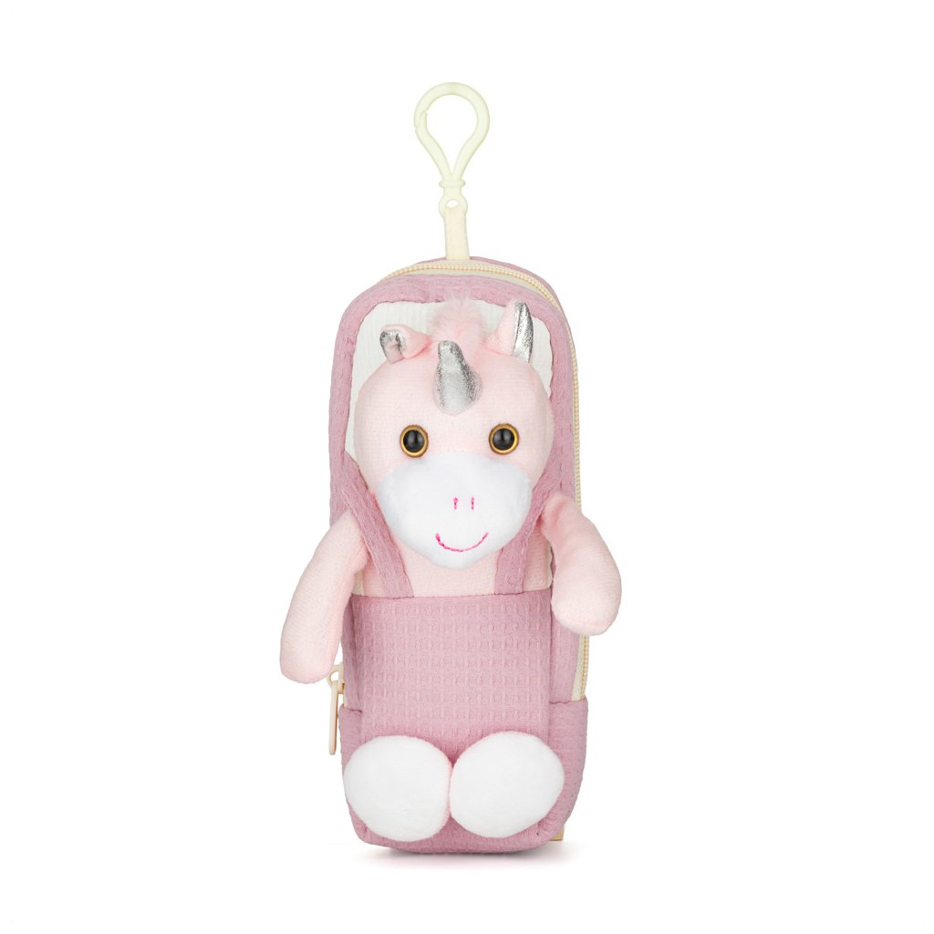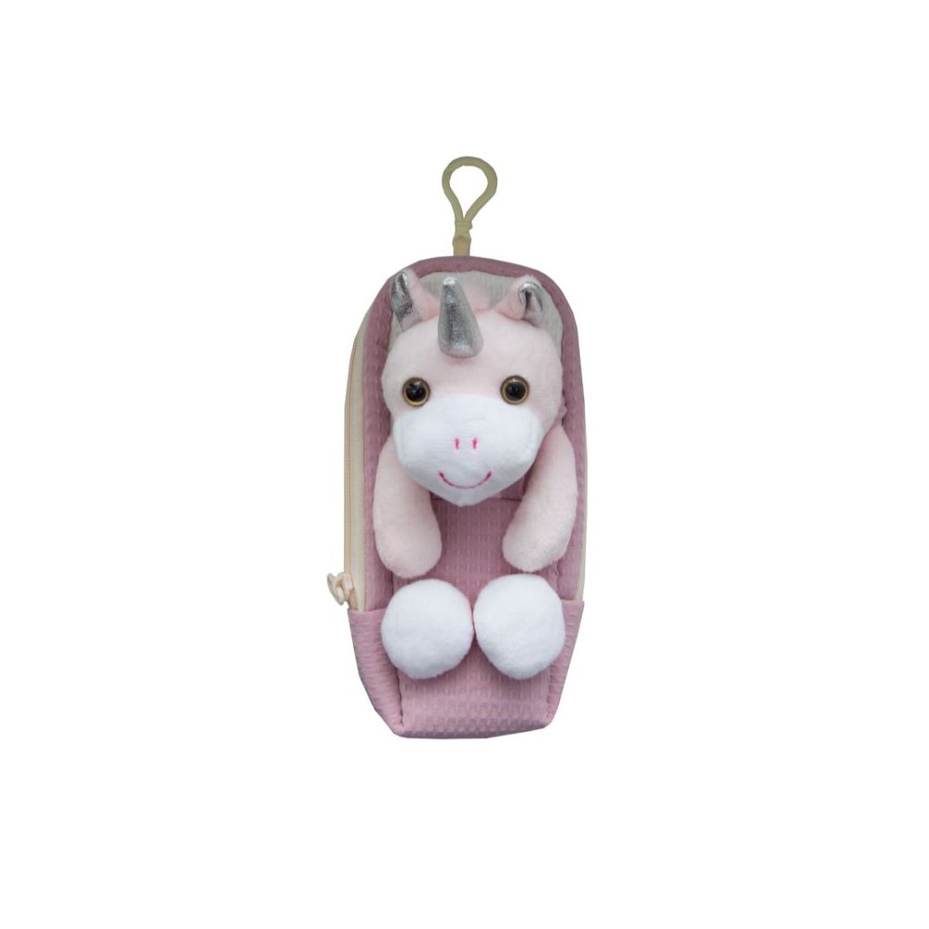 Na prednej strane je prišitý plyšový jednorožec s hebkou hřívou, hlavou a kopytkami, takže pôsobí ako malý plyšák, ktorý stráži všetky detské poklady. Puzdro sa otvára zhora a je vyrobené z mäkkého plyšového materiálu v kombinácii s textilnou tkaninou.