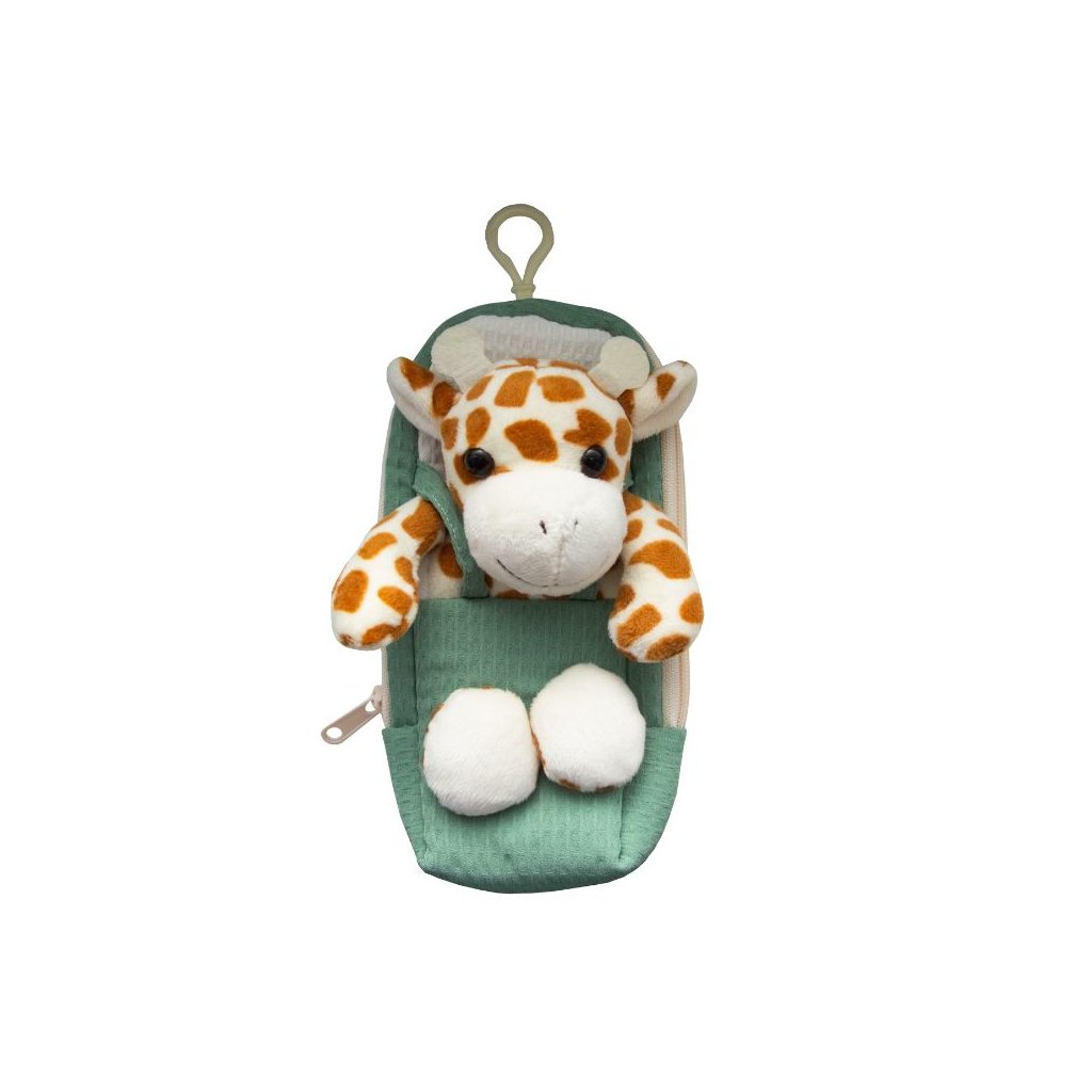Na prednej strane je prišitá plyšová žirafa s hebkou hlavou a nožičkami, takže pôsobí ako malý plyšák, ktorý stráži všetky detské poklady. Puzdro sa otvára zhora a je vyrobené z mäkkého plyšového materiálu v kombinácii s textilnou tkaninou.
