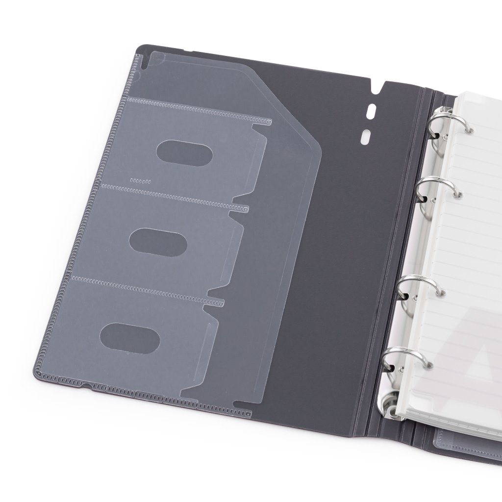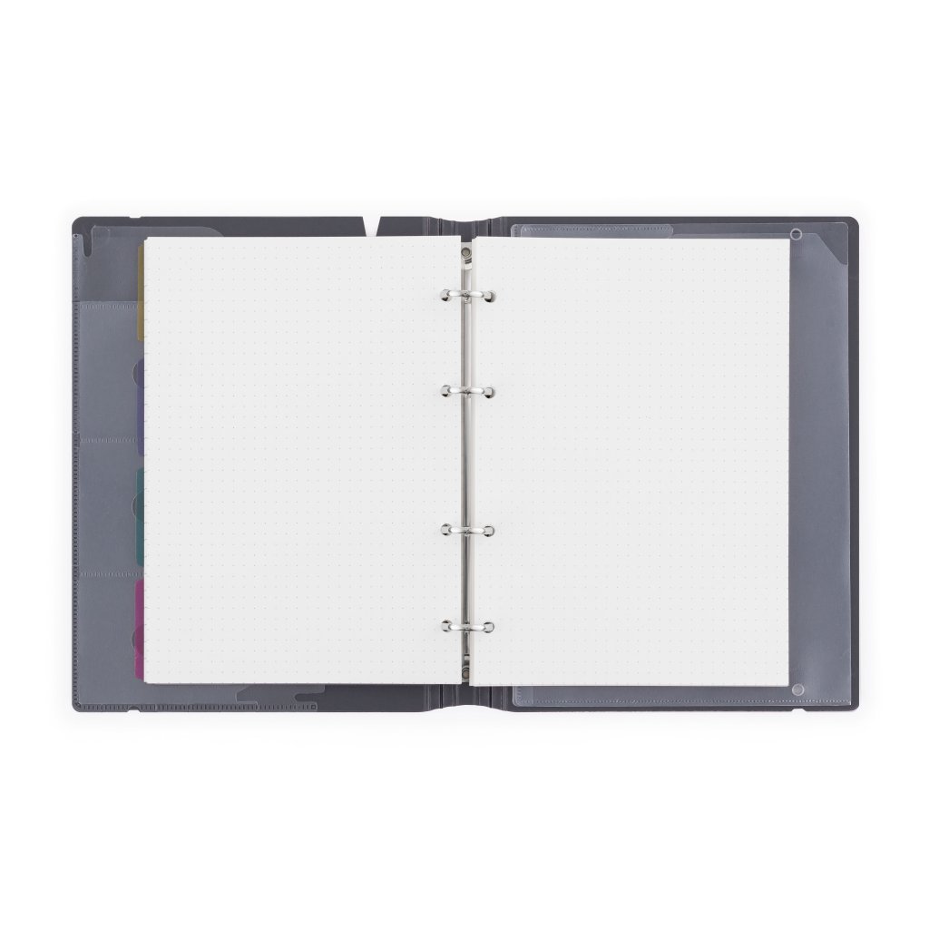 Karis blok z kolekcie Verde: funkčný a štýlový štvorkrúžkový blok vo veľkosti A5, vyrobený z odolného materiálu. Tento blok ponúka praktické rozraďovače a vnútornú náplň: 30 strán linajkových, 30 strán bodkovaných a 30 strán čistých (bez potlače). So zapínaním na elastickú gumičku a vnútornými vreckami na vizitky.