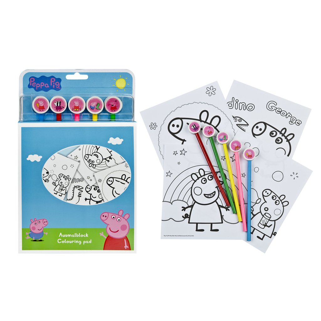 Zábavná sada omaľovánok s obľúbenými postavičkami zo seriálu Prasiatko Peppa poteší všetkých malých umelcov.