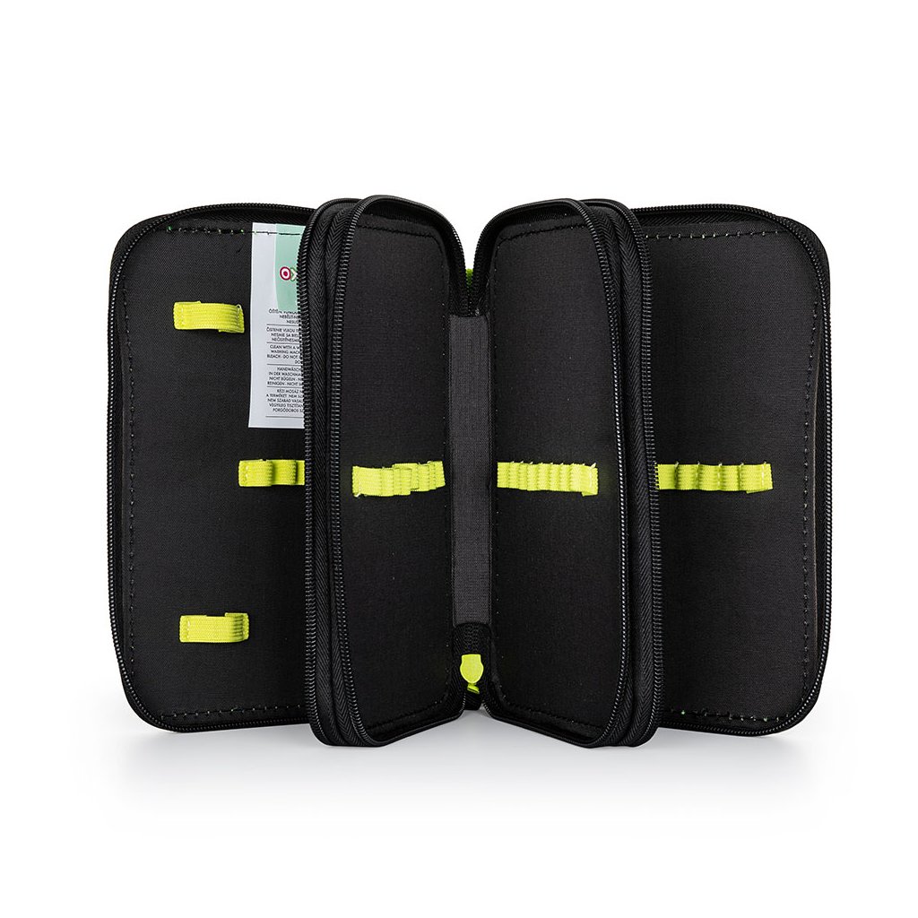 Školský peračník trojposchodový bez náplne. Peračník obsahuje 40 gumových pútok na uloženie všetkých písacích potrieb a drobností potrebných na výučbu. Peračník má pevný zips s veľkými ťaháčikmi pre jednoduchú manipuláciu. Jedno poschodie je opatrené priehľadnou priehradkou pre týždenný rozvrh.
