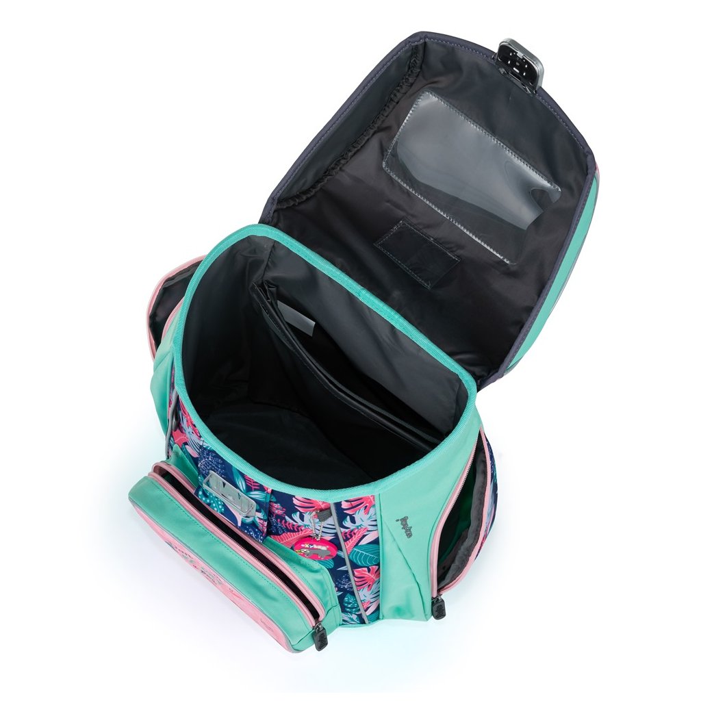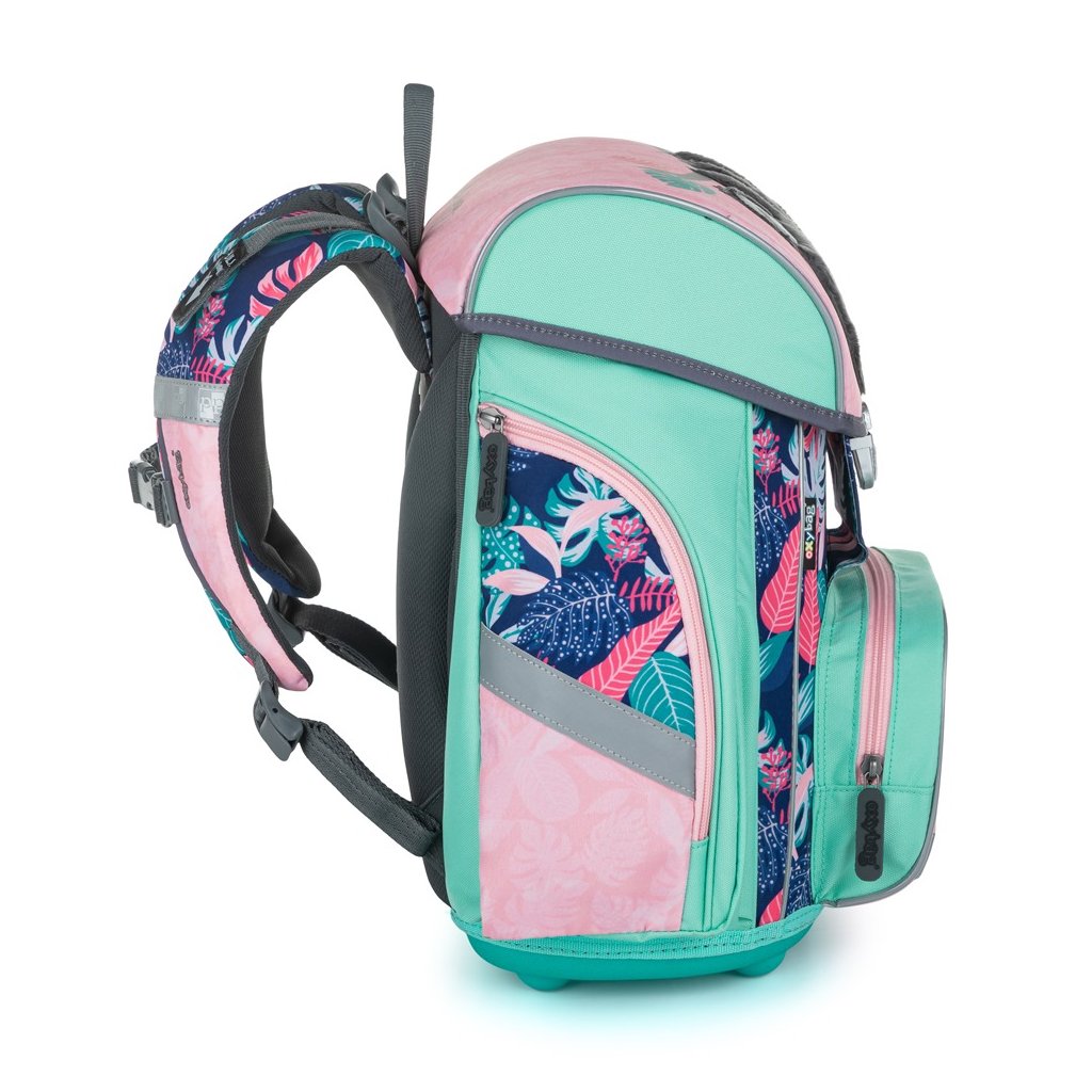 Pevné dno s nôžkami zabraňuje ako ušpineniu zvonku, tak pretečeniu čohokoľvek, čo sa vyleje vo vnútri. Na prednom diele nájdete praktické vrecko na desiatu a po stranách dve väčšie vrecká. Iste oceníte aj pracku pre bezpečné zatváranie a reflexné prvky.