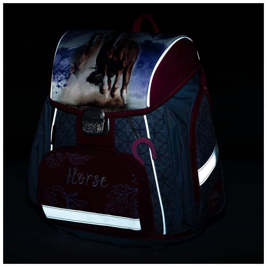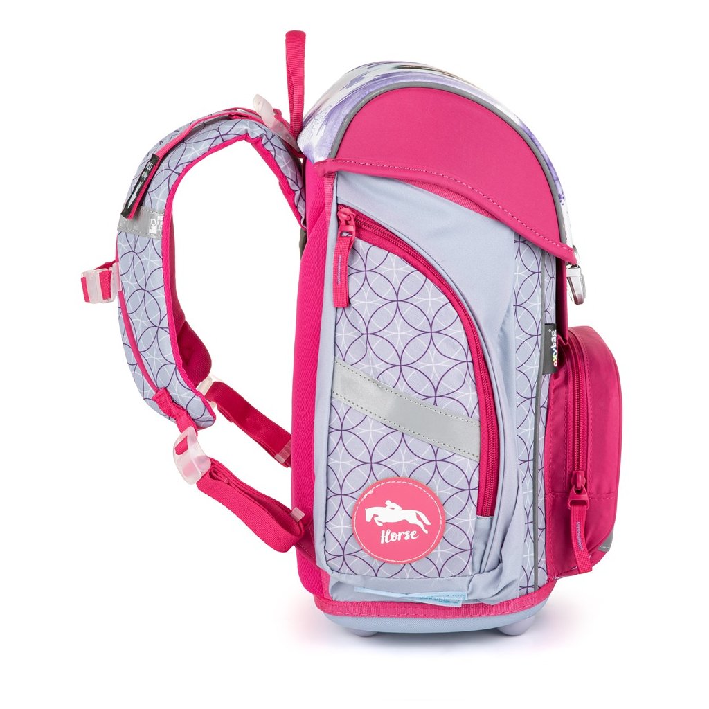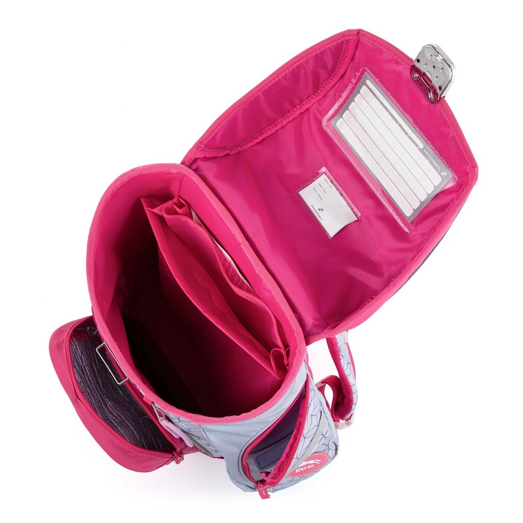 Pevné dno s nožičkami zabraňuje zašpineniu z vonkajšej strany aj pretečeniu čohokoľvek, čo by sa mohlo rozliať vo vnútri. Na prednej strane nájdete praktické vrecko na desiatu a po bokoch dve väčšie vrecká. Určite oceníte aj pracku na bezpečné zatváranie a reflexné prvky. Vnútorné usporiadanie aktovky presne zodpovedá potrebám prvákov a druhákov – do priestrannej hlavnej komory sa ľahko zmestia všetky potrebné školské pomôcky, až do hmotnosti 8 kg.
