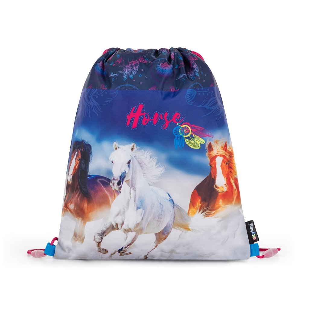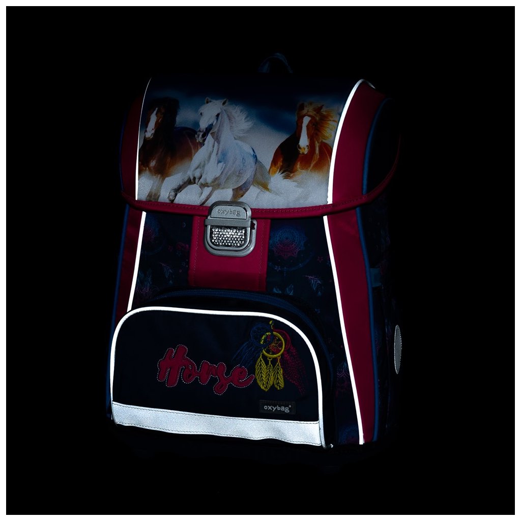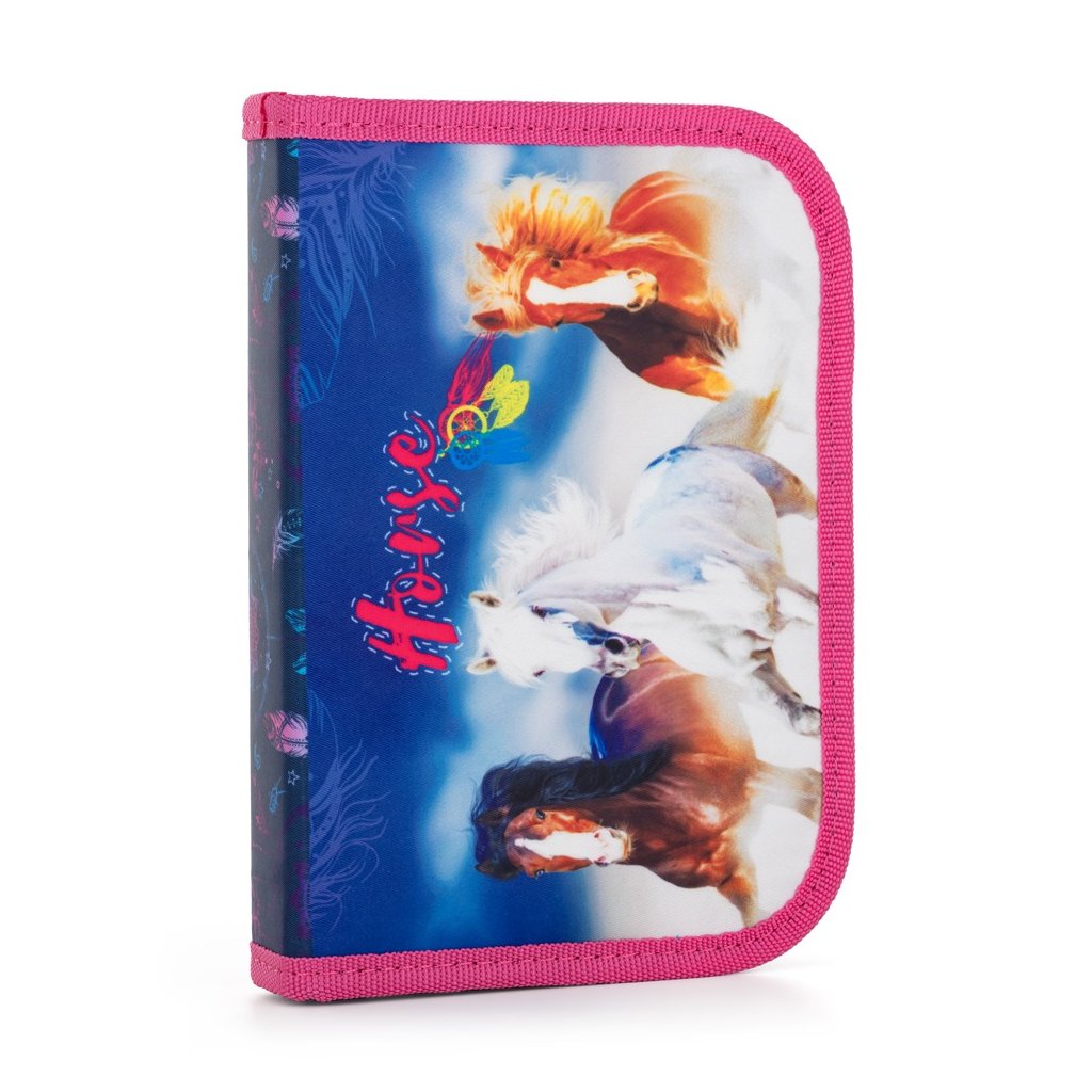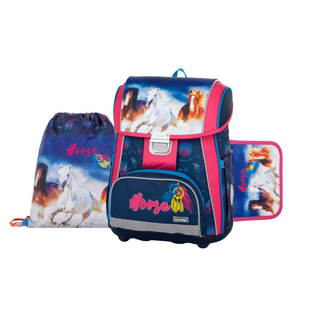 Školský set aktovky PREMIUM Kôň s jednoposchodovým peračníkom a vreckom na prezuvky.
