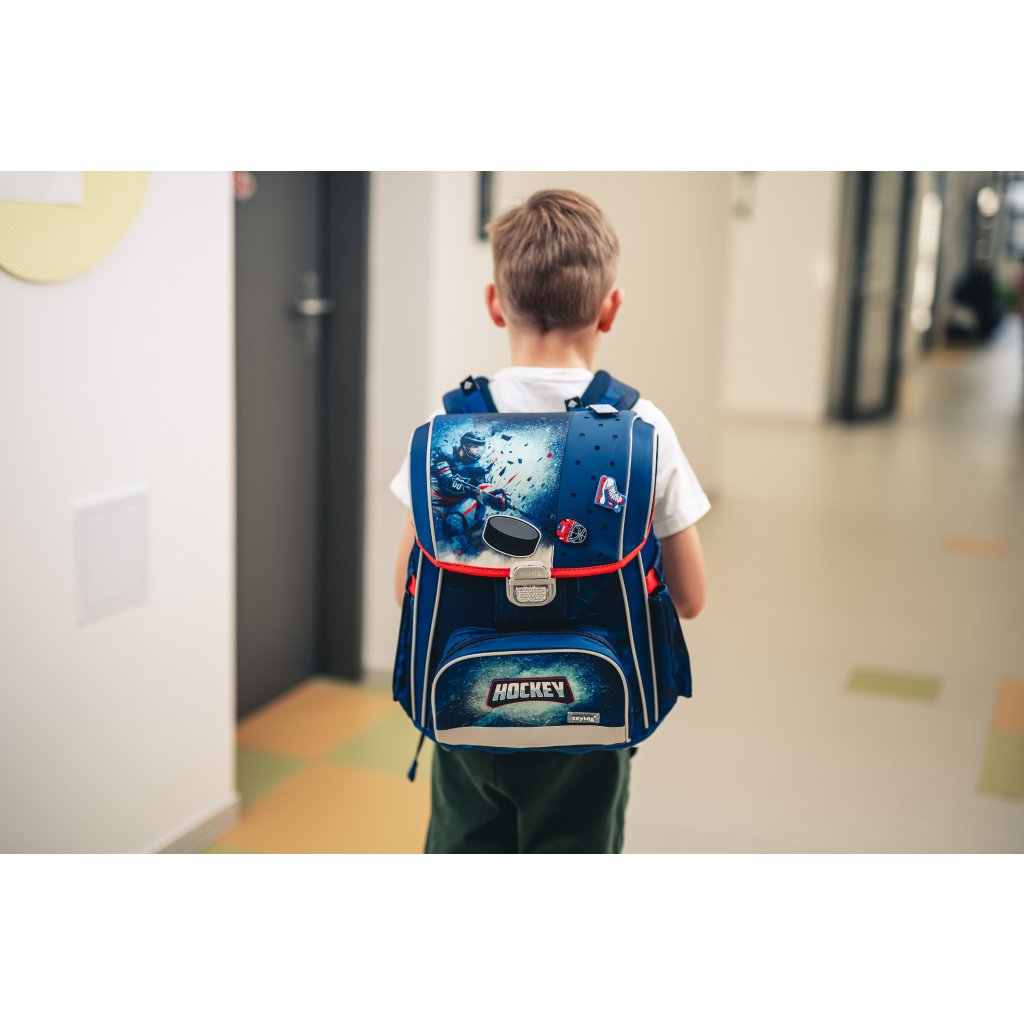 Školský set aktovky PREMIUM Hokej s jednoposchodovým peračníkom a vreckom na prezuvky.