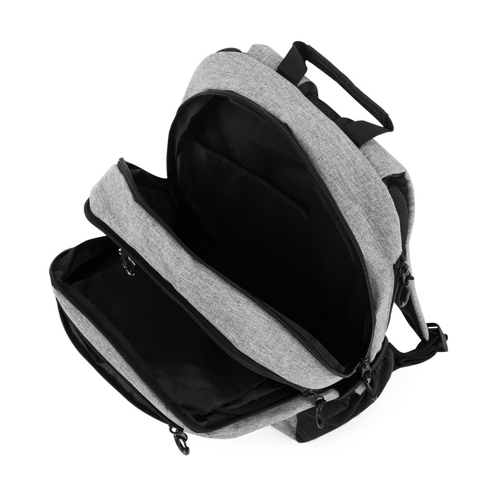 • Praktické úložné priestory – dve hlavné komory, priehradka na notebook 15", menšie vrecko na zips, dve bočné vrecká na fľašu a skryté vrecko na chrbte pre bezpečné uloženie cenností.