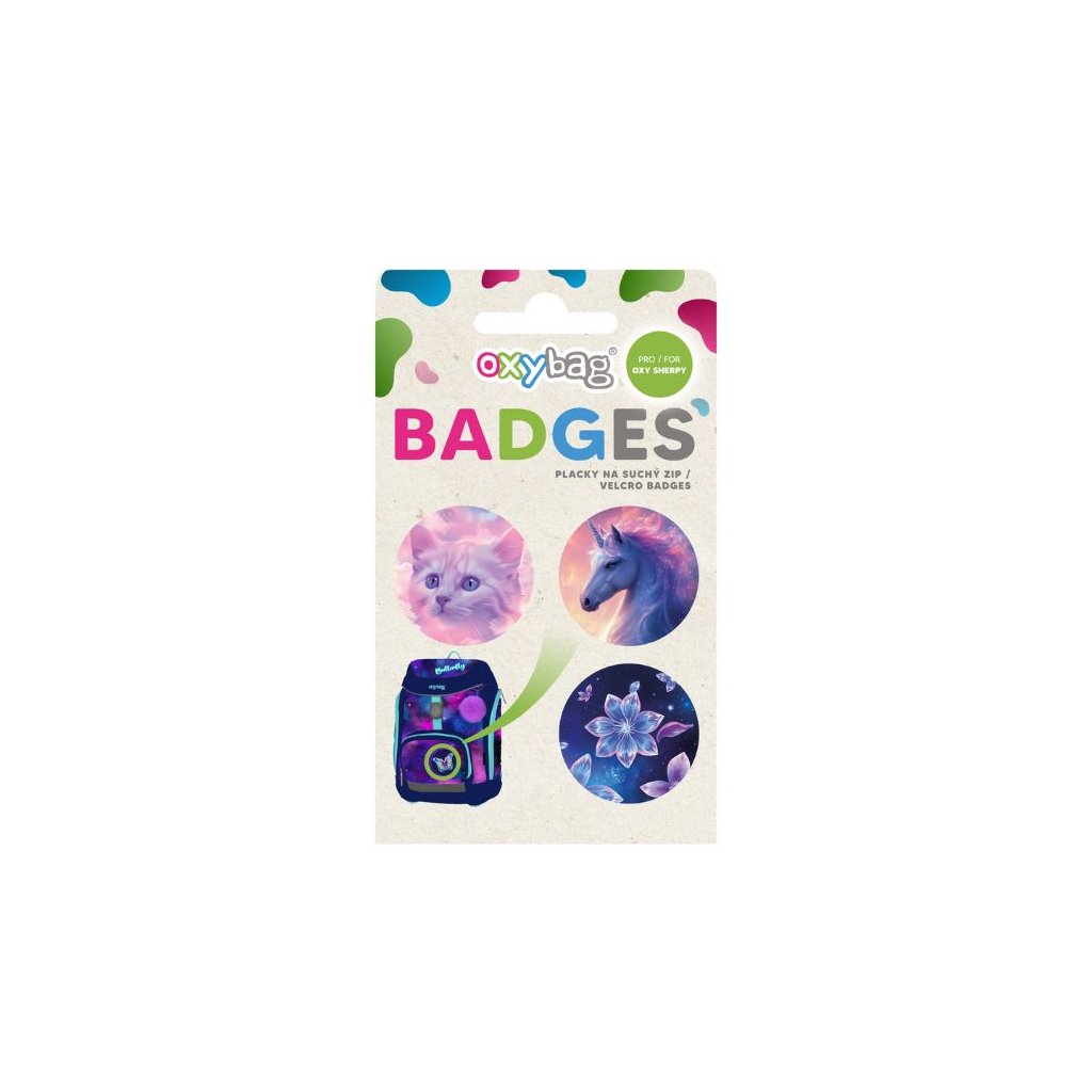 Školský set aktovky OXY Sherpy Kolibrík s jednokomorovým peračníkom, vrecúškom na prezuvky a sadou vymeniteľných odznakov (placek).