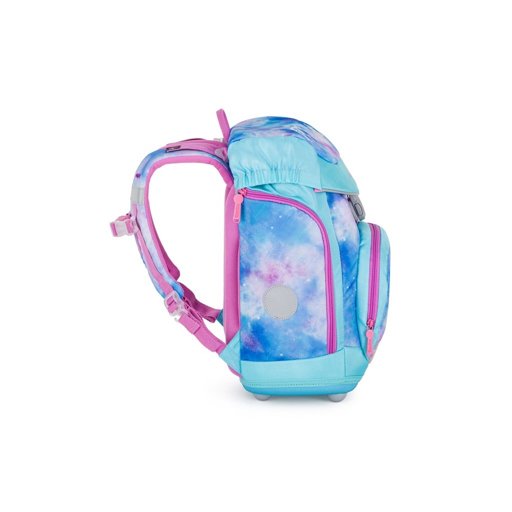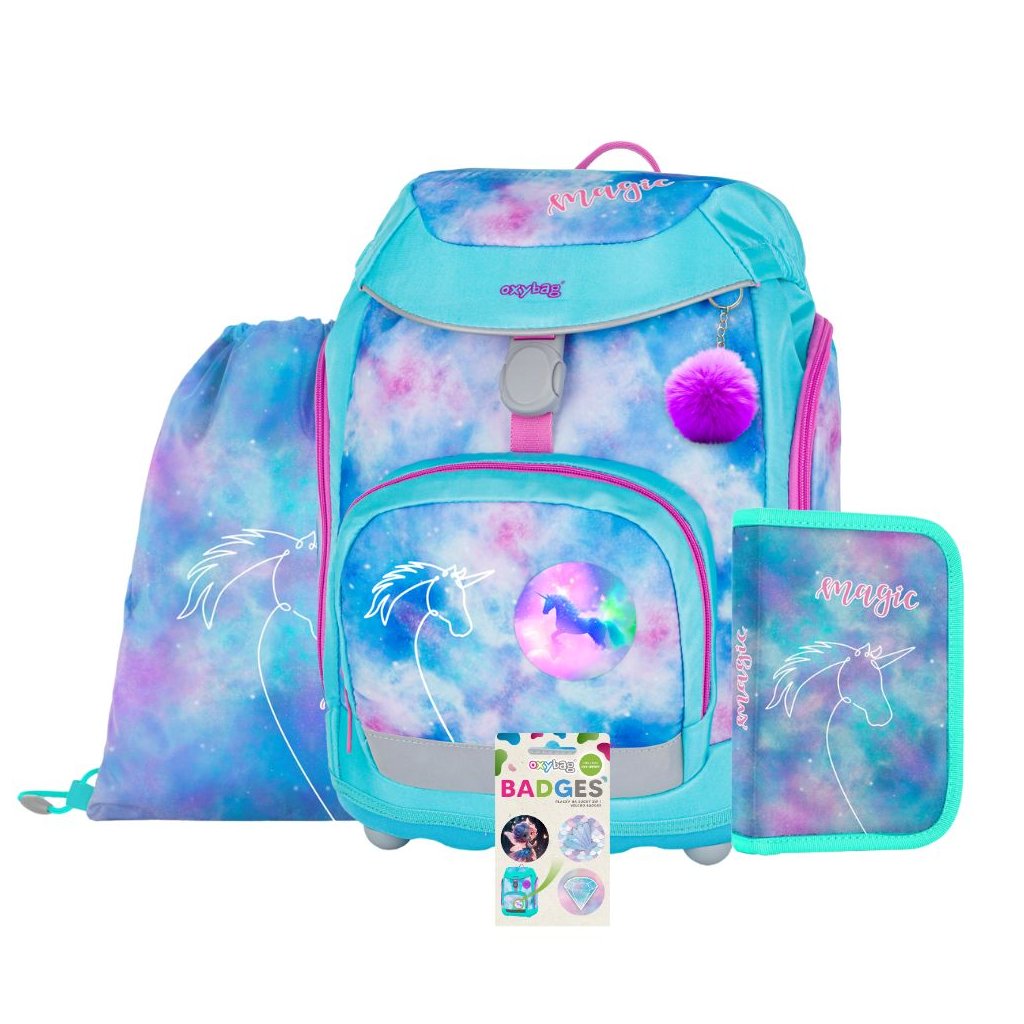 Školský set aktovky OXY Sherpy Unicorn s jednokomorovým peračníkom, vrecúškom na prezuvky a sadou vymeniteľných odznakov (placek).