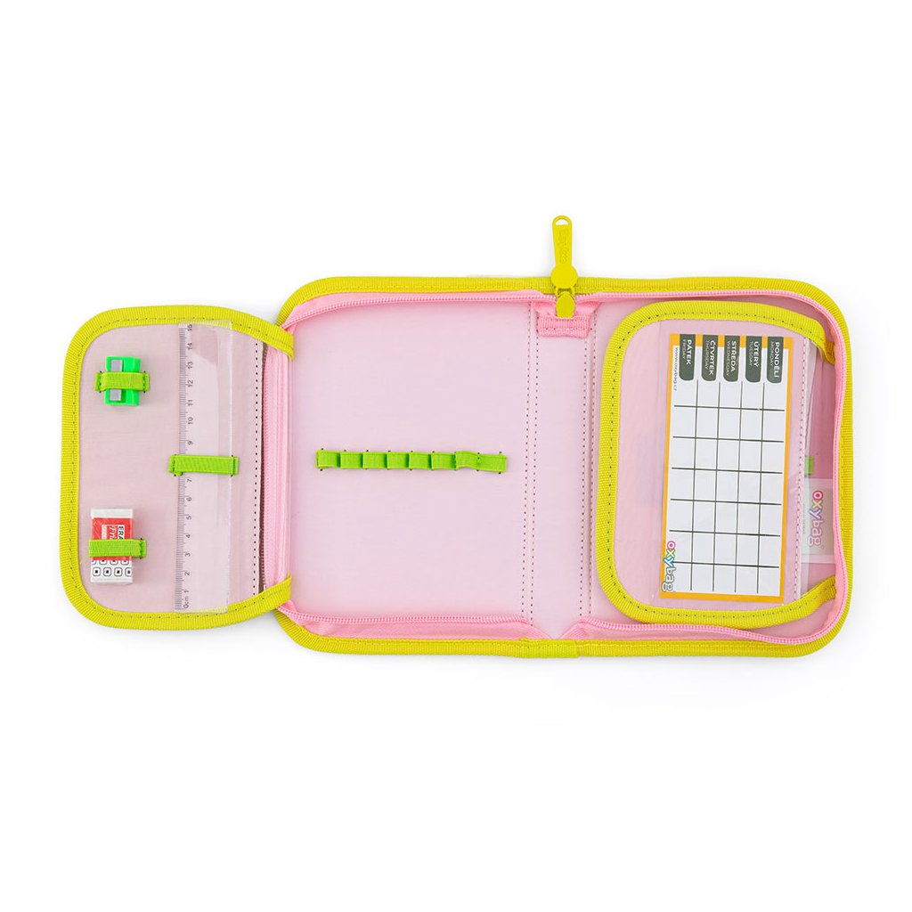 Jednoposchodový školský peračník s 2 chlopňami, prázdny obsahuje 25 gumových pútok na uchytenie písacích potrieb. Na vnútorných chlopniach sú priehľadné fólie na rozvrh hodín.