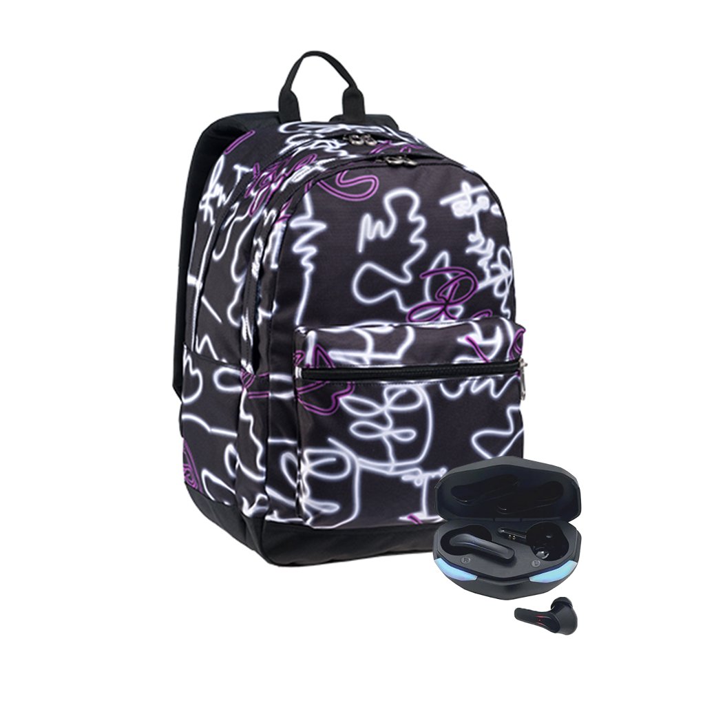 Bezdrôtové slúchadlá s LED osvetlením, integrovaným mikrofónom a puzdrom s nabíjacou základňou. Neotočný dvojkomorový batoh. Nová ochrana proti krádeži na hlavnom otvore.